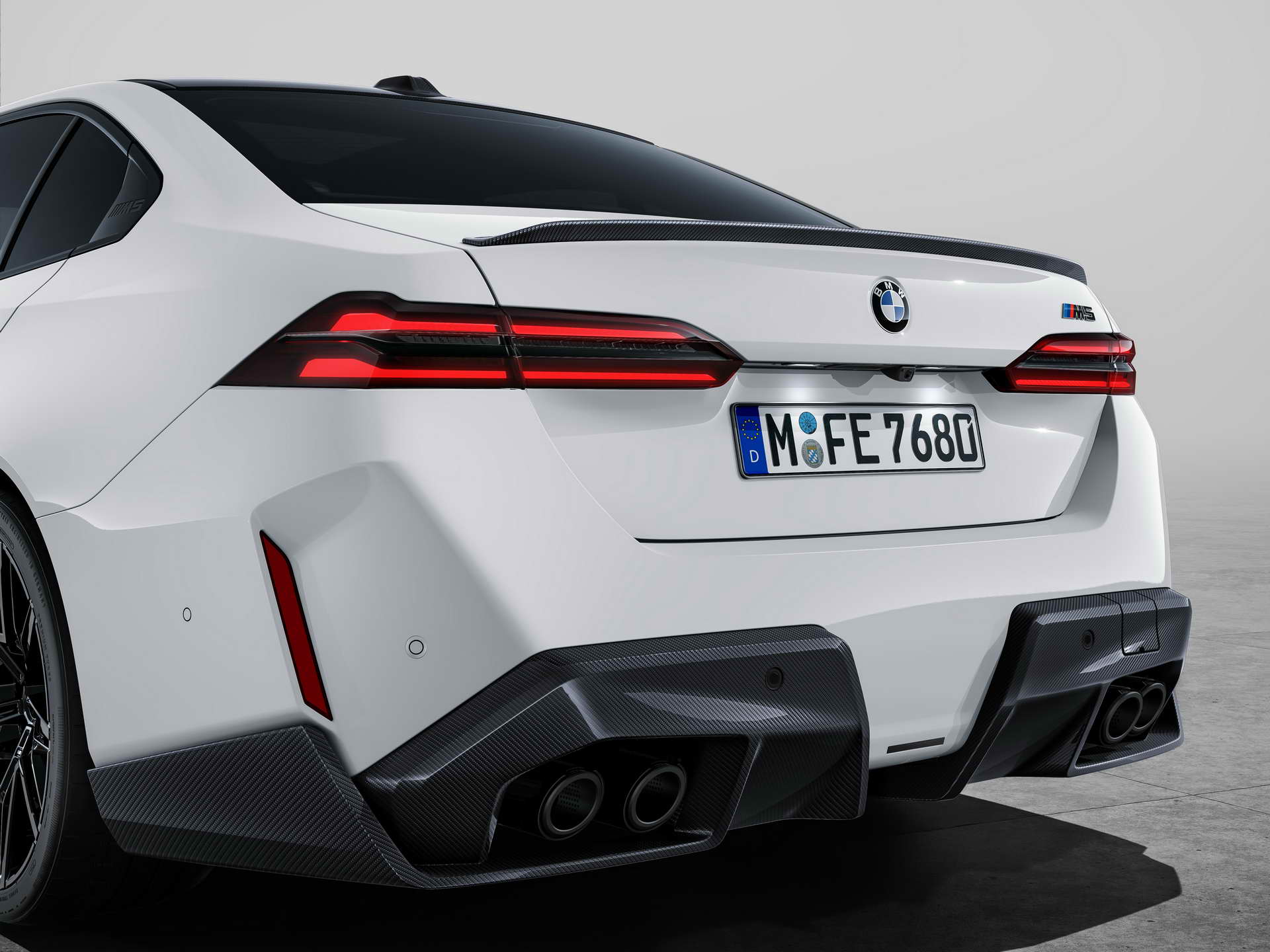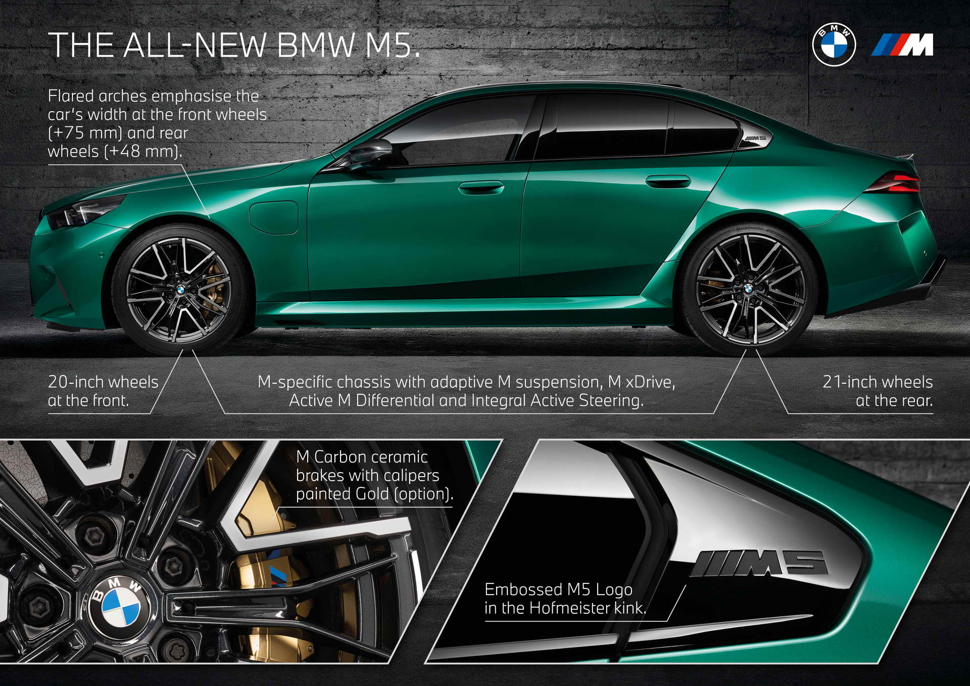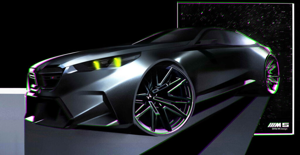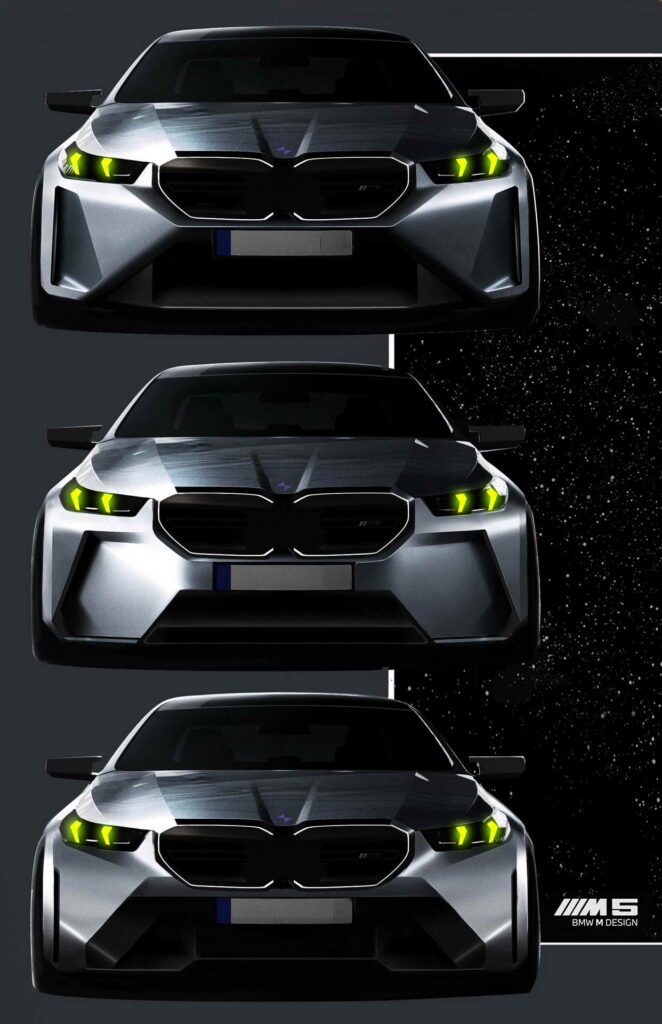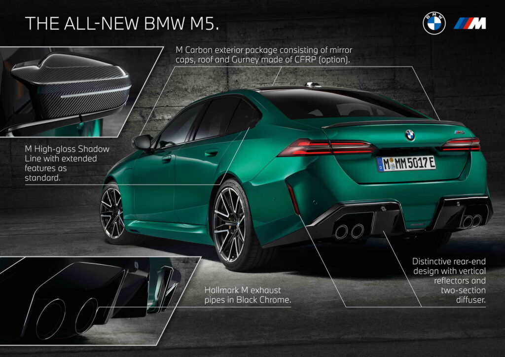 Што се однесува до дизајнот, BMW и овојпат се поигра со бубрезите. Маската сега има црн дизајн со затворени делови во средина зад кои се сместени системите за помош во возењето, а нејзината рамка може да биде осветлена. Крилата се проширени за да се сместат тркалата со пневматици со димензии 285/40 ZR20 напред и 295/35 ZR21 назад, зад кои се наоѓаат сопирачките дискови од 410 односно 398 милиметри кои со доплата можат да бидат керамички. Бруталноста на техниката назад ја покажуваат М-спојлерот и двојните црни издувни цевки. Во однос на стандардната серија 5 внатрешноста се разликува по мултифункционалните седишта како компромис меѓу удобноста на големи дистанци и држењето на телото во спортско возење, новиот дизајн на управувачот, специфичното амбиентално осветлување и стандардниот Bowers & Wilkins Surround Sound аудио систем, а кој сака може да нарача и карбонски покрив.