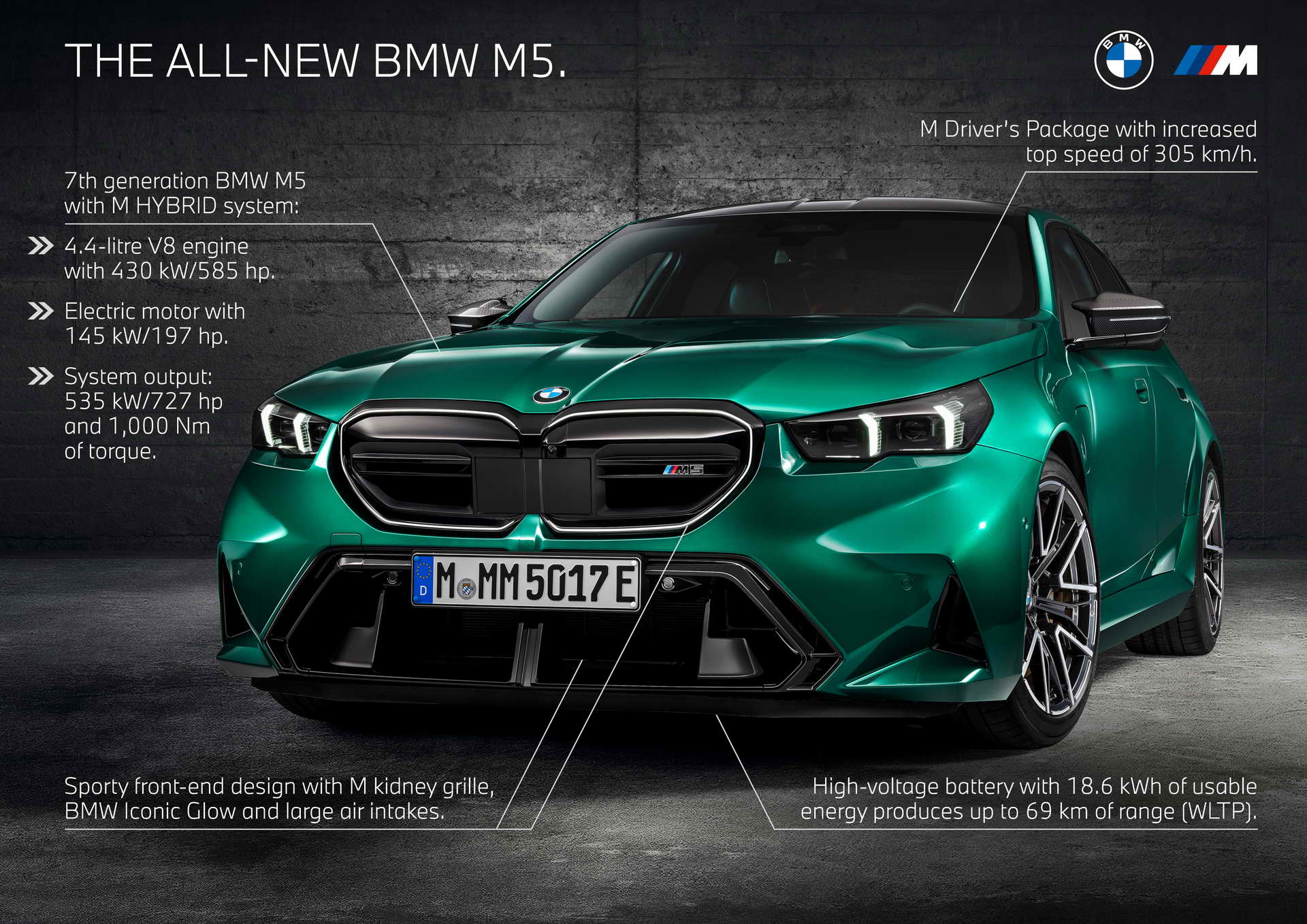 Хибрид е, многу посилен, уште повеќе потежок и малку побавен и поскап од претходникот, ама е BMW M5, без дискусија. Главната новост сепак е што за разлика од Mercedes Баварците не побараа купувачите да ја платат цената на електрификацијата возејќи со помалку цилиндри – M5 и понатаму има 4,4 литарски V8, сега со плаг-ин можности. Колку електрични километри поминува воопшто не е битно, затоа и BMW не ја многу истакнува оваа бројка. Не ни мора кога погонскиот систем на баварската бомба испалува вкупно 727 коњски сили и брутални 1000 Nm вртежен момент. За жал заради тежината од масивни 2.445 килограми спринтот до сто на час трае 3,5 секунди, додека максималната брзина е ограничена на 250 односно 305 km/h со M Driver‘s пакетот.