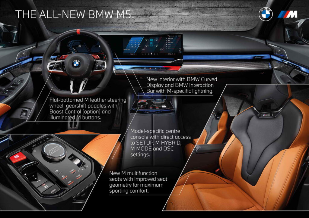 Кои се предностите на хибридниот систем што го има новиот М5 воопшто нема да наведуваме – ќе кажеме само дека електромоторот дополнувајќи ја силата на V8 агрегатот низ целиот распон вртежи обезбедува позабавно брзо возење и поугодно крстосување по автопатските широчини, оптимизирано со осумстепениот автоматски менувач и погонот на сите тркала. Оние пак кои ќе посакаат да му ја истераат душата на ѓаволот го имаат на располагање Boost Control системот кој го поставува погонскиот систем на максимум. Ако пак некој посака уште повеќе целосно ќе може да го исклучи испраќањето на силата на предните тркала со што BMW M5 ќе стане способен да ги остварува и дрифт-соништата. Технологијата до толку е софистицирана што ако треба M5 може да ја испраќа целата сила на само едно тркало.