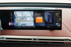 Иако се чини дека е еден долг дисплеј, тоа се всушност два различни прикази. Пред возачот е 12,3-инчен дигитален дисплеј во улога на инструмент табла и приказ за сите функции поврзани со возењето додека централниот екран на допир е од 14,9 инчи. Тие се поставени рамо до рамо и покриени со едно парче стакло. Дисплејот е светол и кристално чист, а новиот iDrive 8 на BMW (iX е првото BMW што го доби iDrive 8) е драматично подобрување во однос на претходните верзии. Сфатив дека системот е лесен за навигација, одговорен и полн со менија кои му дозволуваат на возачот да го постави возилото да работи според неговите преференции.