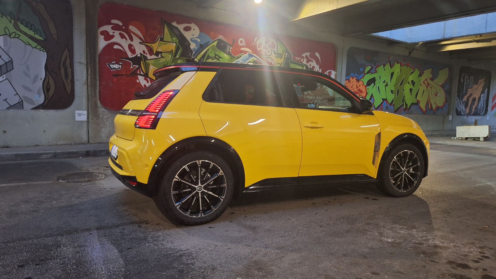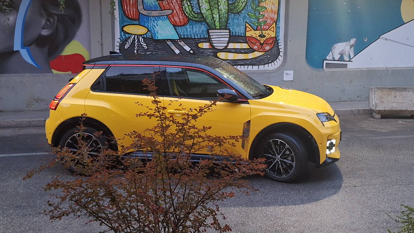 Оттука и обликот на линијата на покривот и задниот спојлер и навестувањето на мускулести лакови на тркалата напред и назад. Сосема ефективна е конверзијата на хаубата. На местото каде што се наоѓаше отворот на оригиналната „петка турбо“ сега стои стилизиран осветлен број 5 што служи како индикатор за нивото на полнење. Исто така, во фаровите има мали француски знаменца и автомобилот ви намигнува кога ќе го отклучите, додека наклонот на задната врата и целокупниот изглед на задните светла се јасно инспирирани од предокот.
